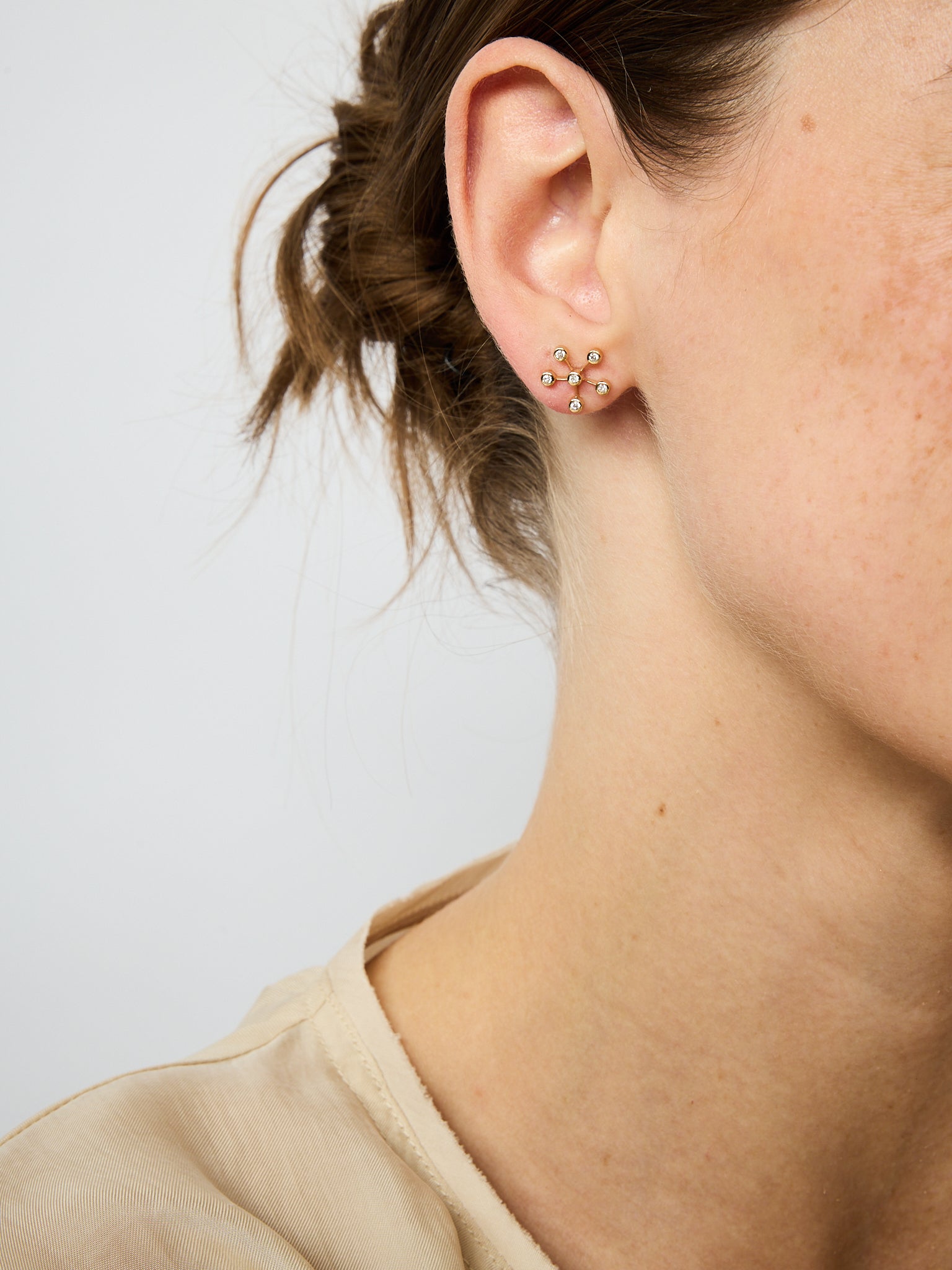 Kuka-me's take on the traditional diamond stud earring. Using diamonds as pinpoints of light, the earrings produce a beautiful scattering of light at the side of the face. Subtle and elegant, they make a delicate style statement.