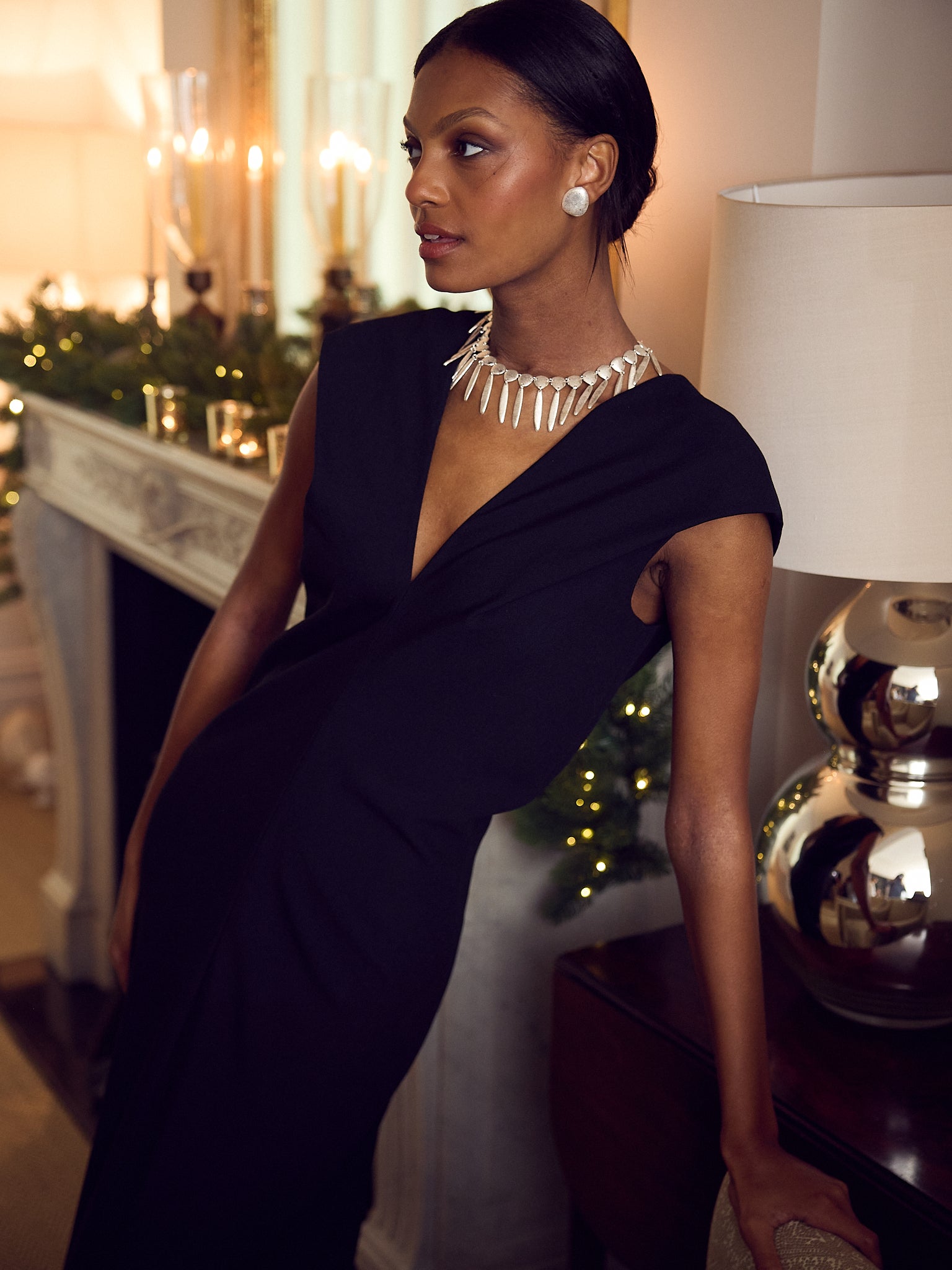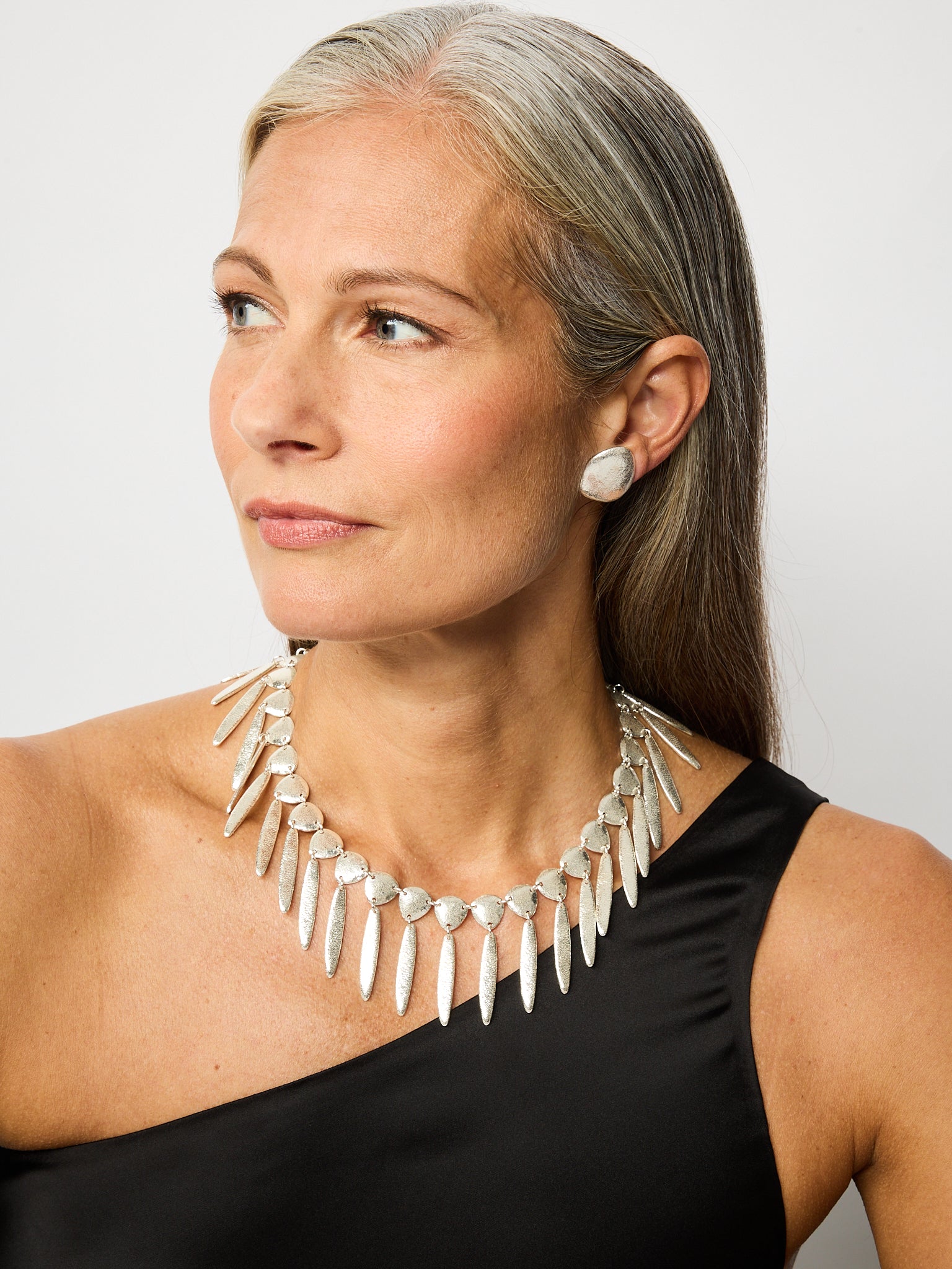 A show-stopping choker that feels glorious to wear. The tapered flint-like pieces fall elegantly from the neck, and are textured to shimmer, shine and glow gorgeously.