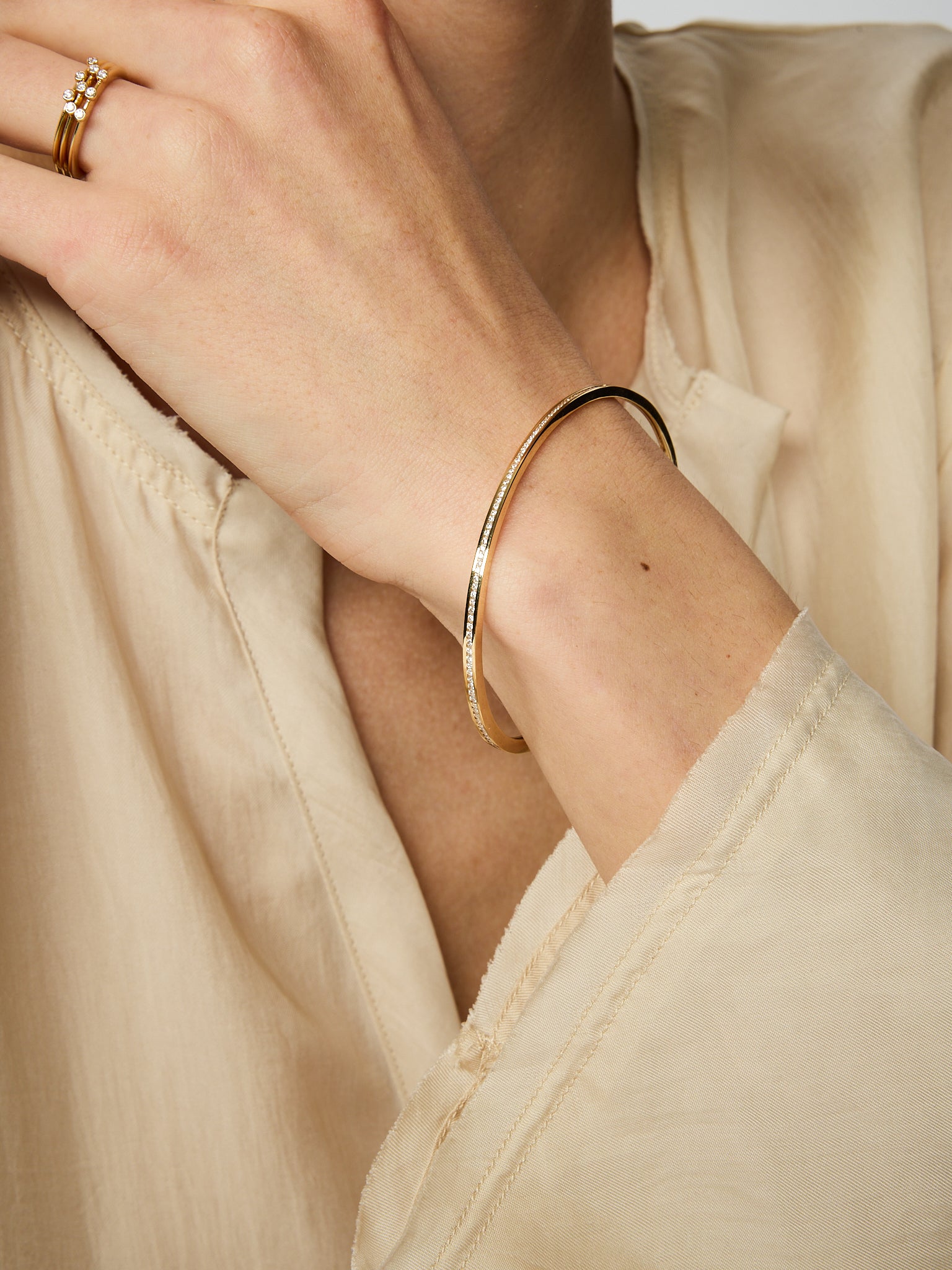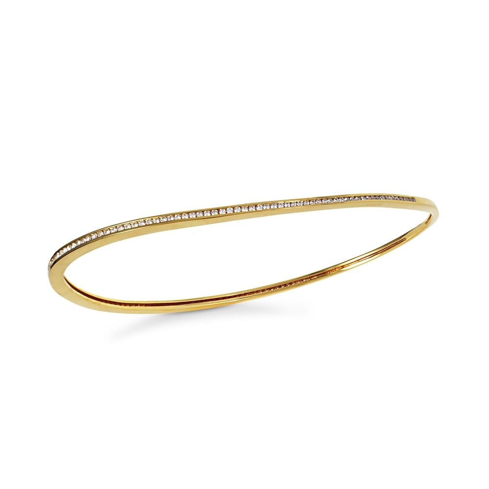 A slice of 18ct yellow gold, highlighted with a row of set diamonds.  The clean lines of this gorgeous bangle make it easy to wear, while the diamonds hint at an understated luxury.
