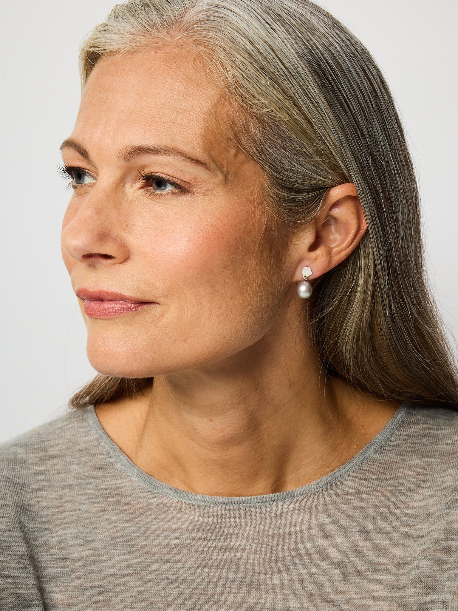 Pale, dove-grey fresh-water pearls drop from a tiny silver petal.