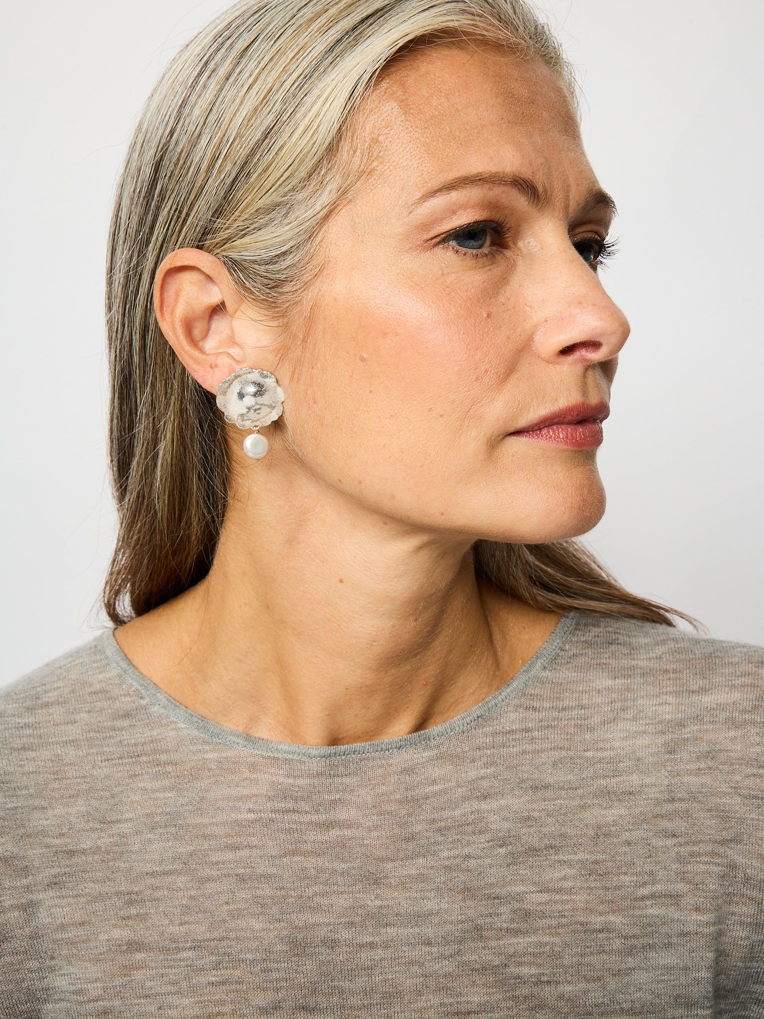 The abstract shape and textured finish of our EDGES flower earrings are complimented by silver grey pearls in these drop earrings.