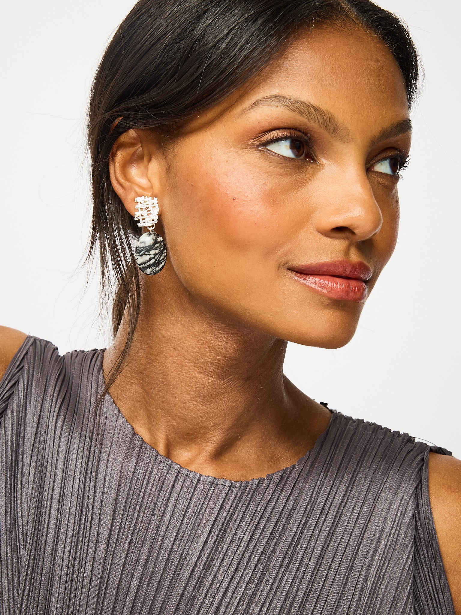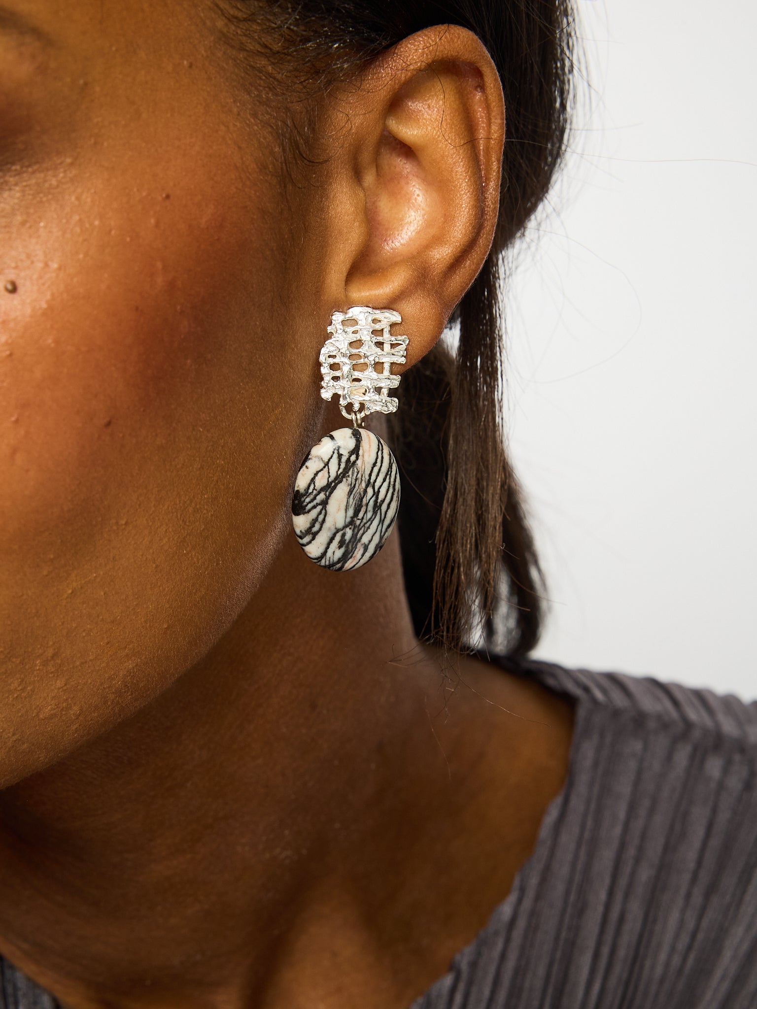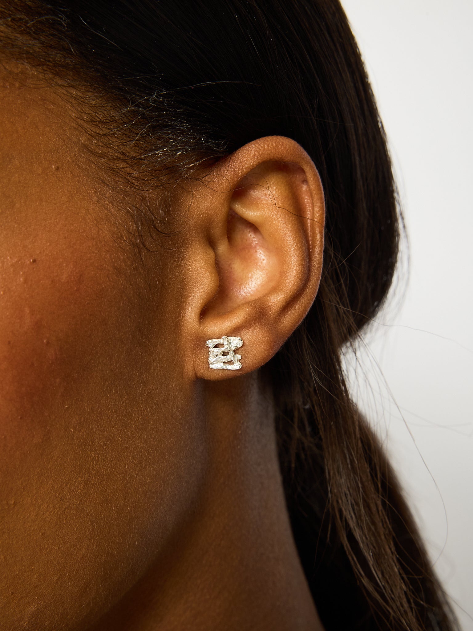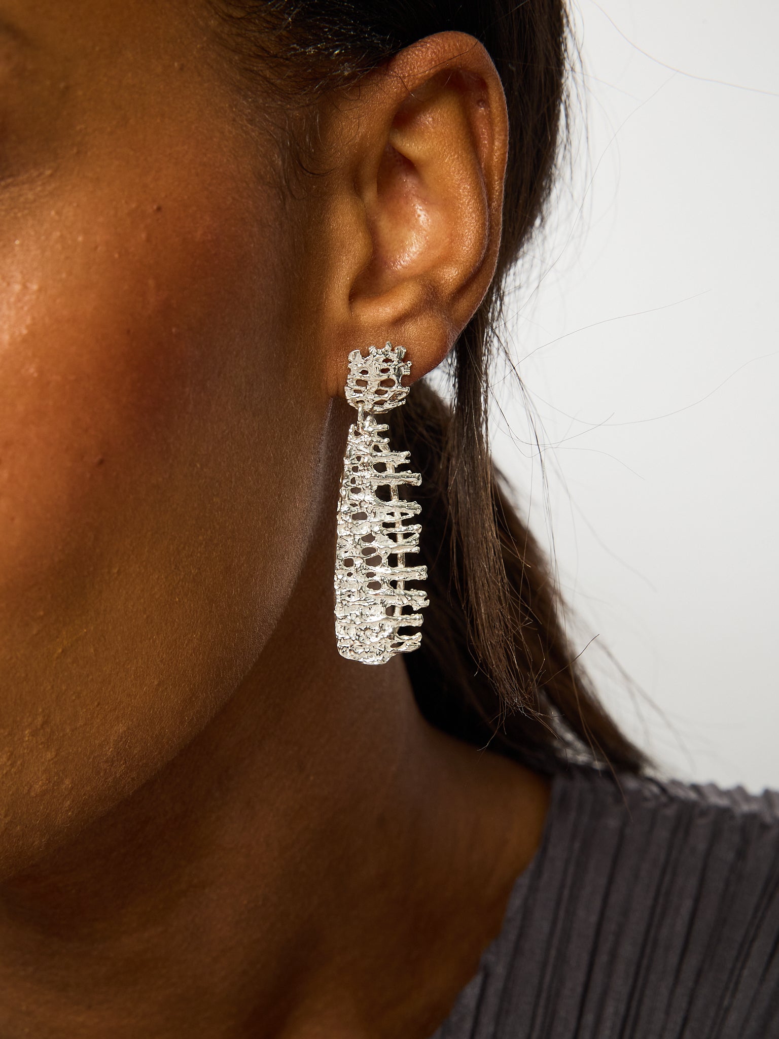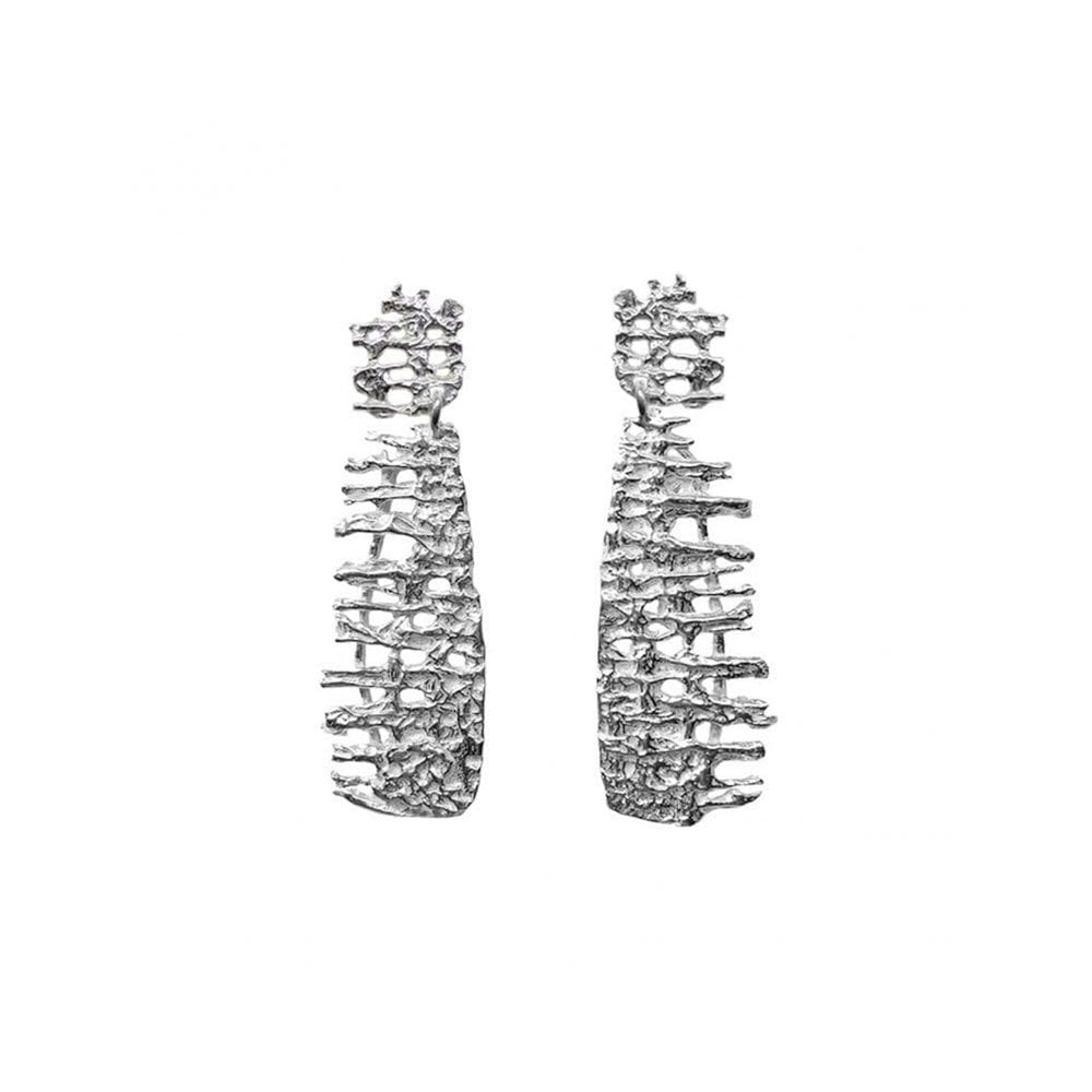 In this collection. the holes and spaces are as important as the solid silver edges. These pieces are like bits of handwriting, or unstructured mark-making, and remind Reema of urban skylines.