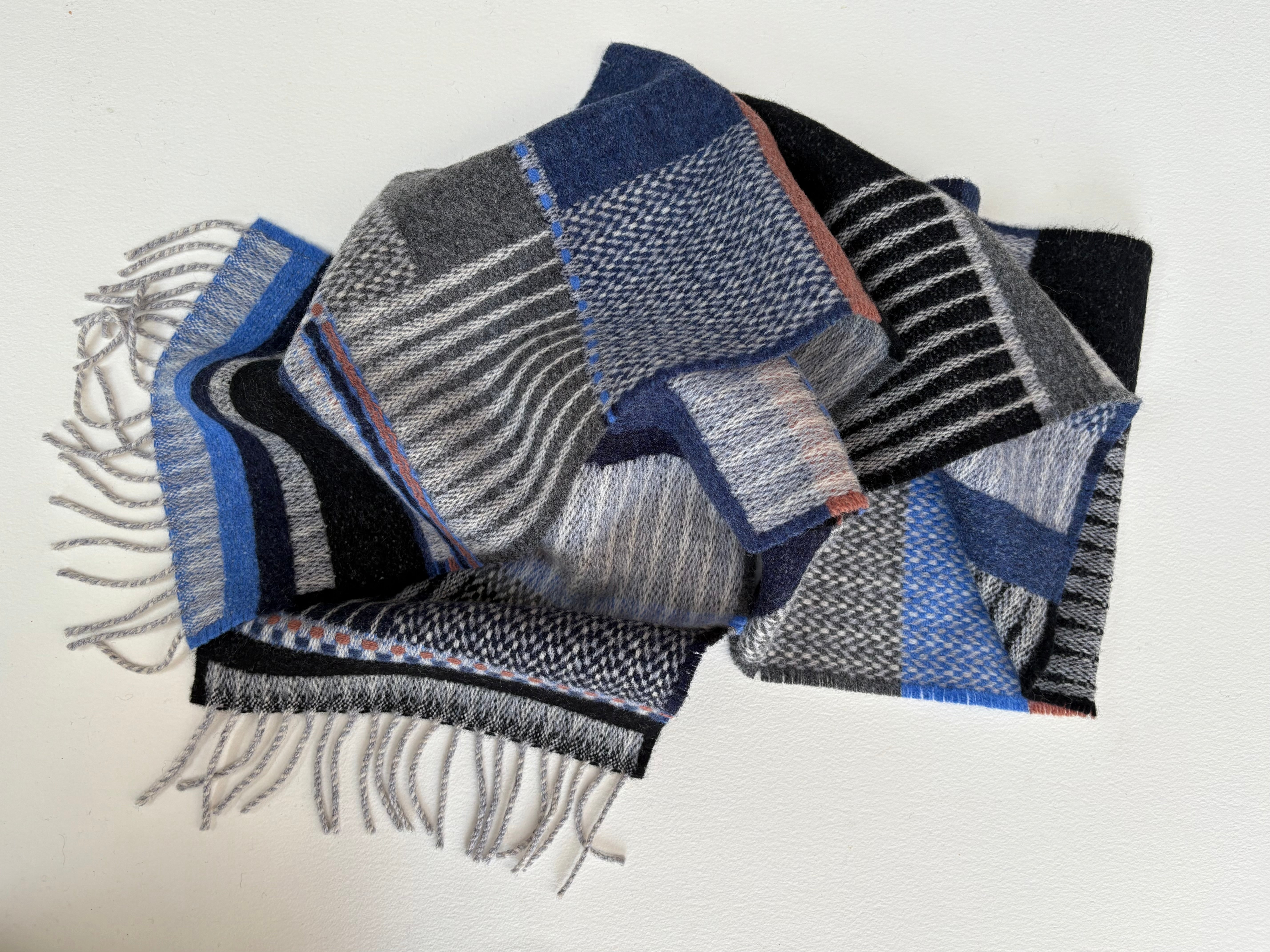 Designed and woven in the UK, this Wallace Sewell 100% Merino wool scarf features a colour pallet of cool blues and greys.