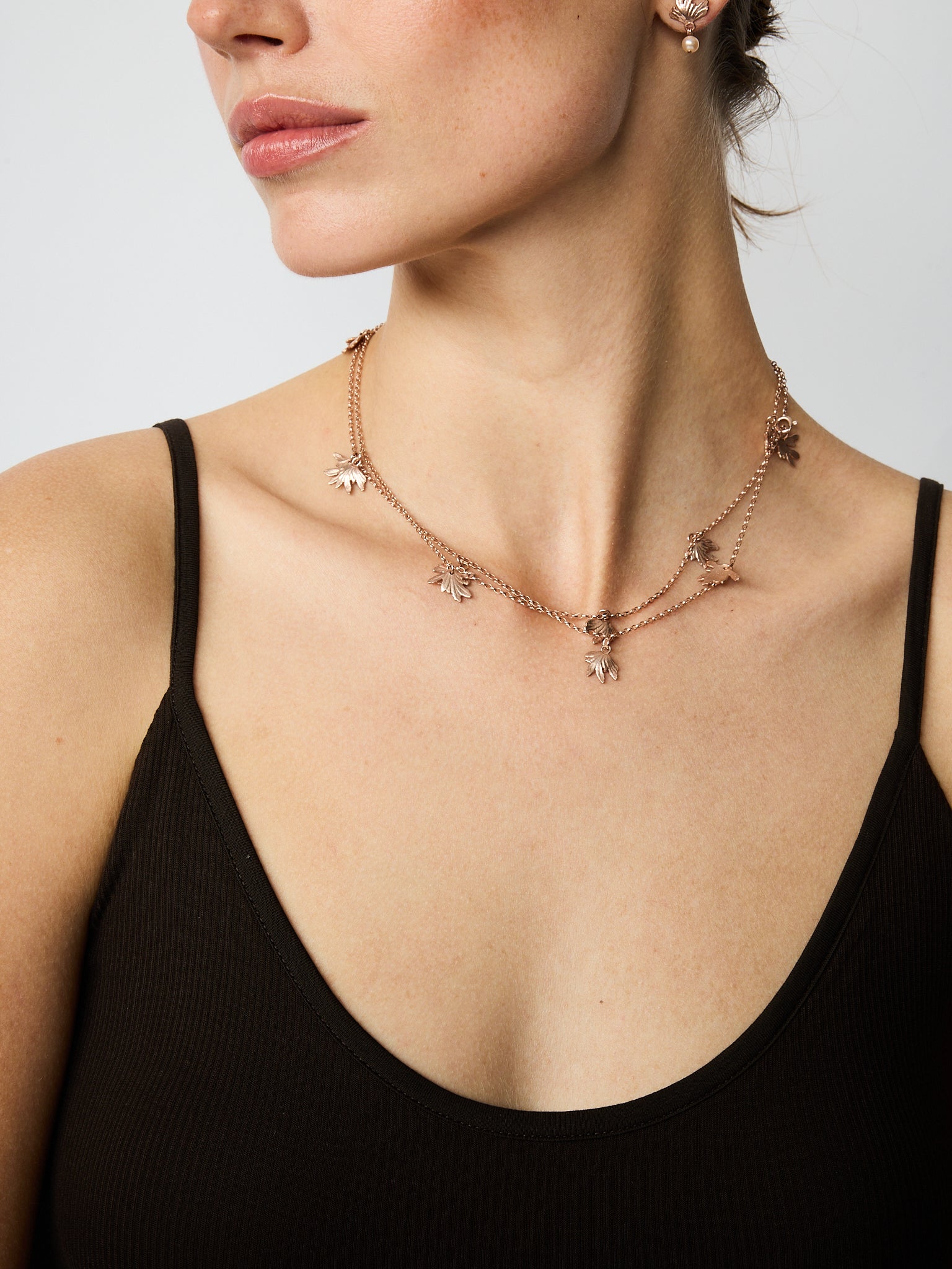 A versatile fine chain of multi-shaped leaves which can be worn long or doubled as a choker.