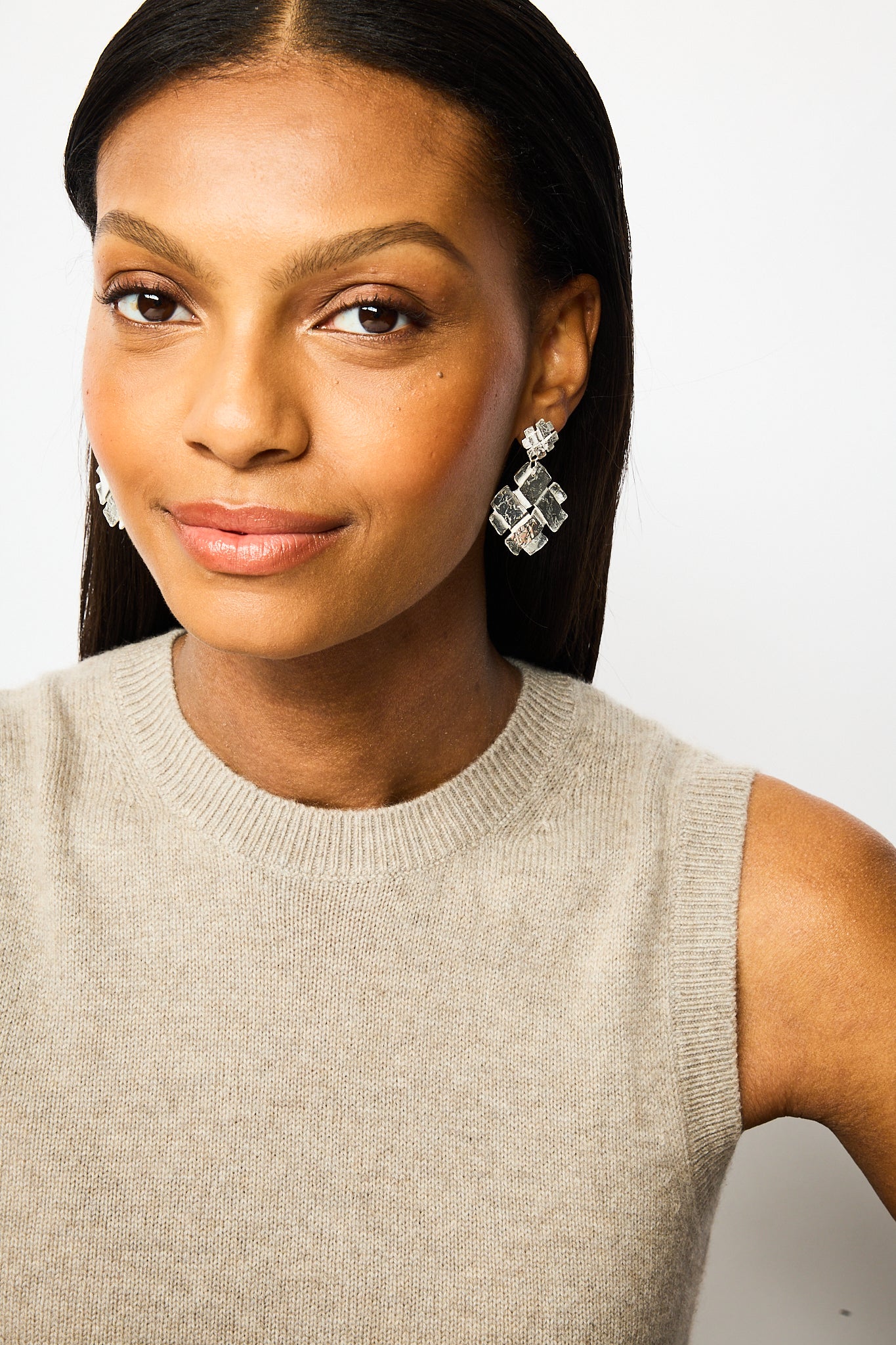 These high impact, silver, drop earrings provide interest, framing the face with cool, graphic shapes.  These textured, silver earrings make an easy to wear statement.